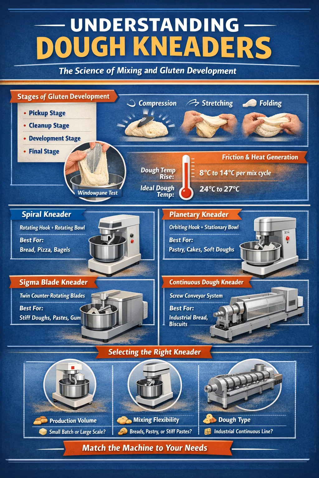 Cho dù bạn đang vận hành một máy nhào bột xoắn ốc nhỏ trong một tiệm bánh lân cận hay đang vận hành một máy nhào bột công nghiệp liên tục xử lý vài tấn mỗi giờ thì các nguyên tắc vật lý và hóa học cơ bản vẫn nhất quán. Những thay đổi là quy mô, hình dạng máy khuấy và mức độ kiểm soát quy trình có sẵn cho người vận hành.