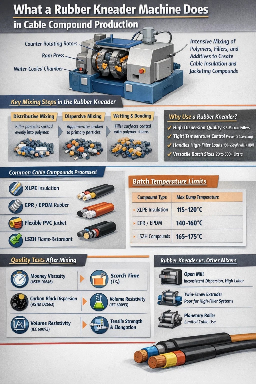 Các nhà sản xuất cáp làm việc với nhiều loại hợp chất đàn hồi và nhựa nhiệt dẻo-đàn hồi. Mỗi nơi đặt ra những yêu cầu khác nhau về thiết bị trộn và máy nhào cao su sẽ xử lý tất cả chúng một cách thường xuyên.