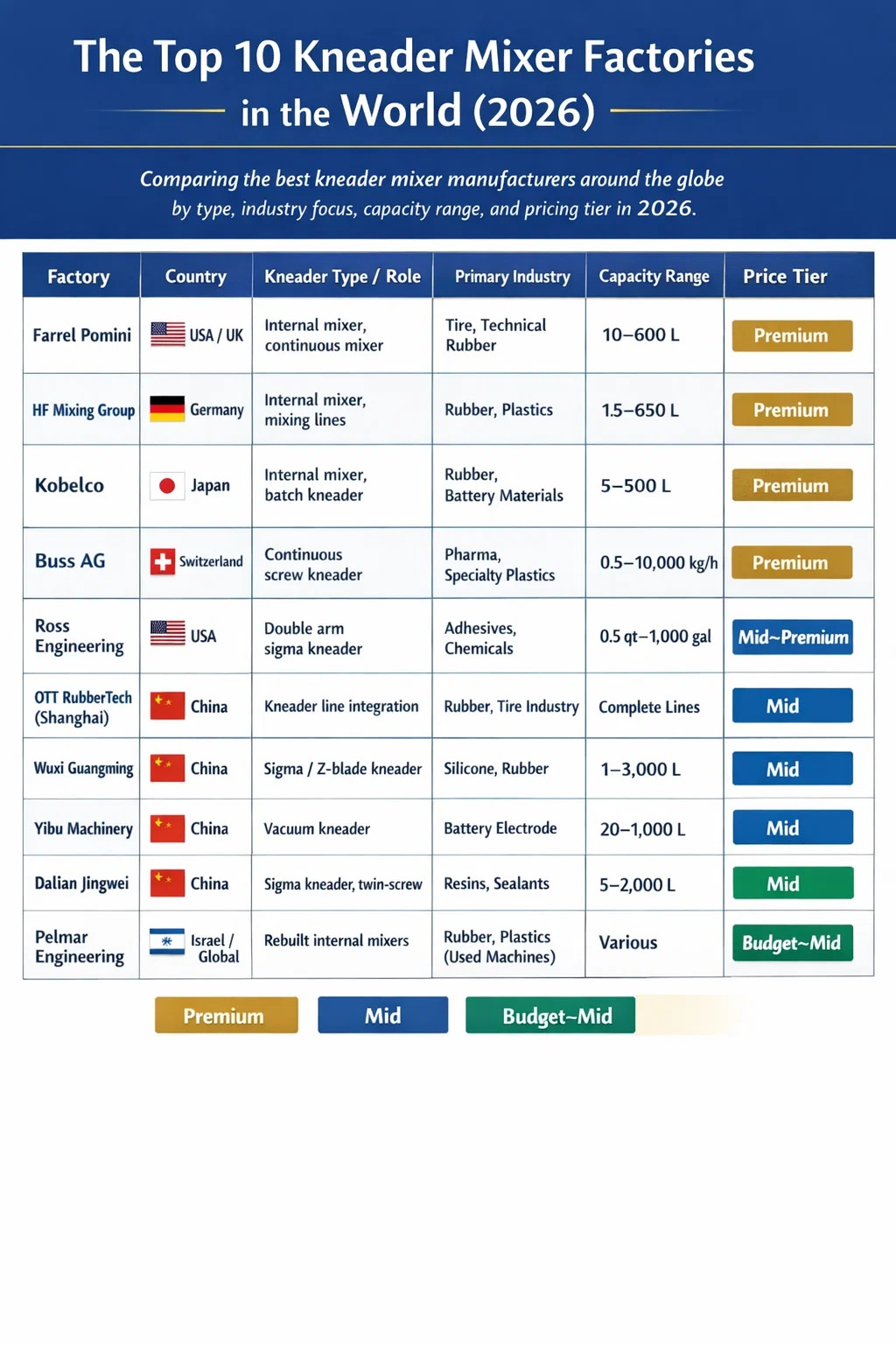 Nếu bạn đang tìm nguồn cung ứng máy nhào máy trộn cao su, silicone, chất kết dính, vật liệu pin hoặc bất kỳ hợp chất có độ nhớt cao nào, nhà sản xuất bạn chọn sẽ trực tiếp xác định tuổi thọ của thiết bị, chất lượng trộn và tổng chi phí sở hữu. Sau khi đánh giá quy mô sản xuất, chứng nhận kỹ thuật, cơ sở lắp đặt toàn cầu và phản hồi của khách hàng trên hàng chục nhà cung cấp, mười nhà máy liên tục dẫn đầu thế giới về sản xuất và cung cấp máy trộn máy nhồi vào năm 2026 là: Farrel Pomini (Mỹ/Anh), Nhóm trộn HF (Đức), Kobelco (Nhật Bản), Xe buýt AG (Thụy Sĩ), Kỹ thuật Ross (Hoa Kỳ), OTT RubberTech International Trading (Shanghai) Co., Ltd. (Trung Quốc), Wuxi Guanming Machinery (Trung Quốc), Máy móc Yibu (Trung Quốc), Đại Liên Jingwei Chemical Machinery (Trung Quốc) và Kỹ thuật Pelmar (Israel). Mỗi loại mang lại một sức mạnh riêng biệt — cho dù đó là công suất mô-men xoắn cực cao, thiết kế vệ sinh cấp dược phẩm, tích hợp dây chuyền nhào cao su hoàn chỉnh hay giá cả cạnh tranh về mặt chi phí cho sản xuất số lượng trung bình.